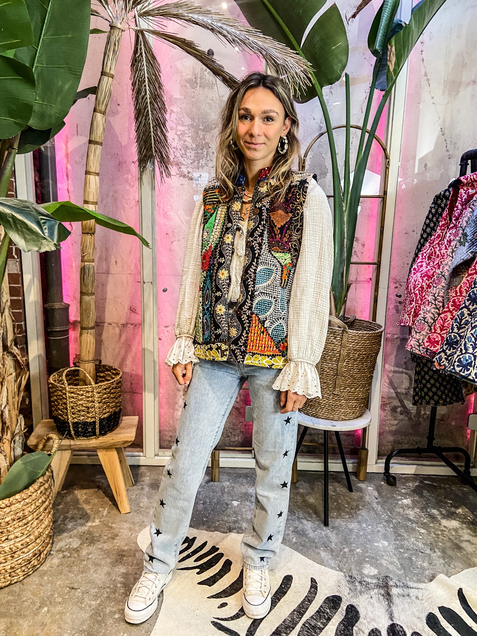 Ons Bonita gilet is een kunstwerkje om aan te trekken! Het vrolijke giletje is handgemaakt en daardoor zijn ze stuk voor stuk uniek. Meestal worden onze Bonita gilets iets oversized gedragen en ze hebben knoopsluitingen. Het gilet wordt minder stug na gebruik.
