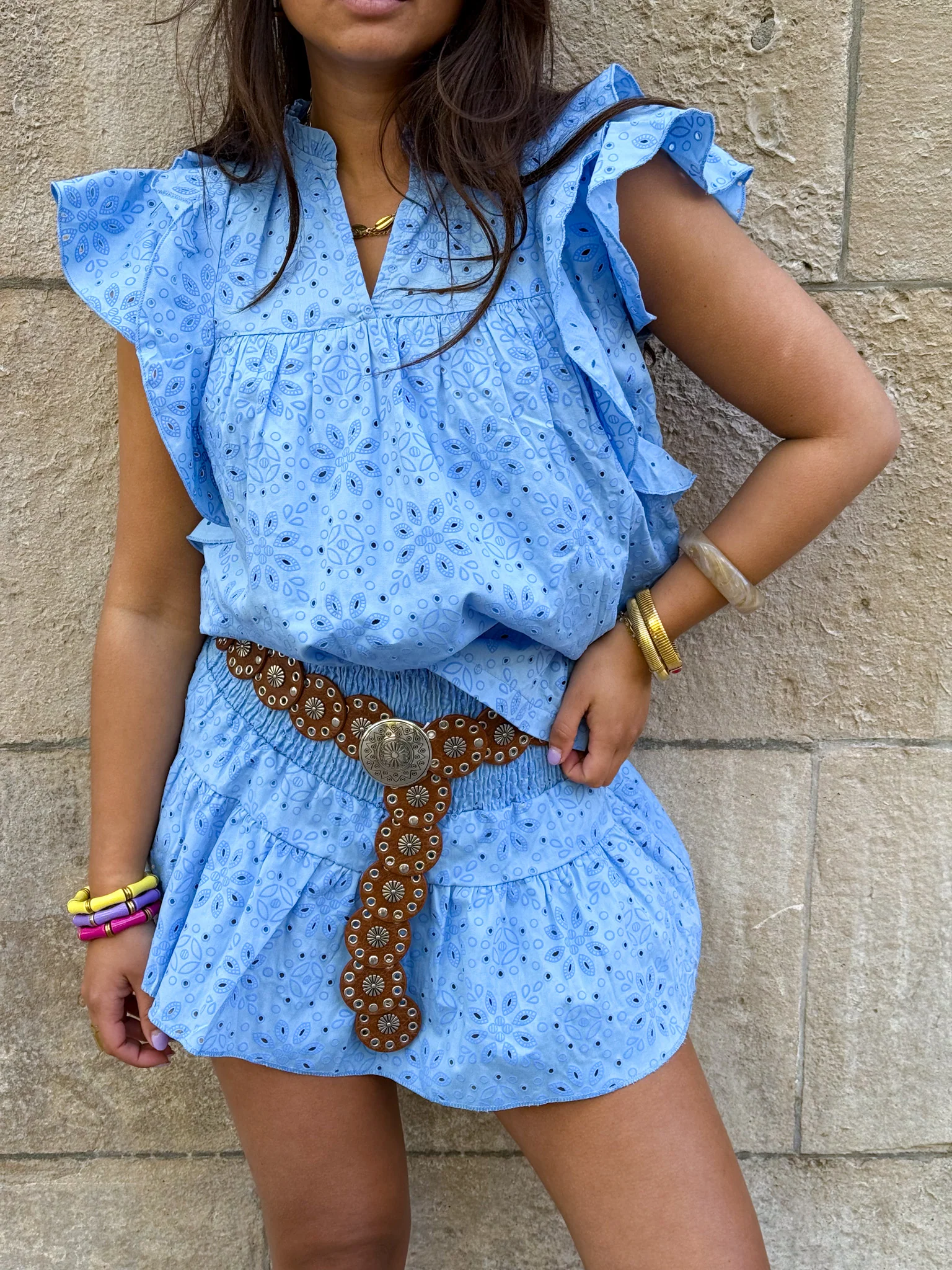 Onze Donatella top is een elegante en vrouwelijke top die je outfitje gelijk een vrolijk randje geeft! Het broderie design geeft een romantische touch en de gelaagde schouder zorgt voor een casual look. Het topje is ook leuk te combineren met de bijpassende Donatella Skort.
