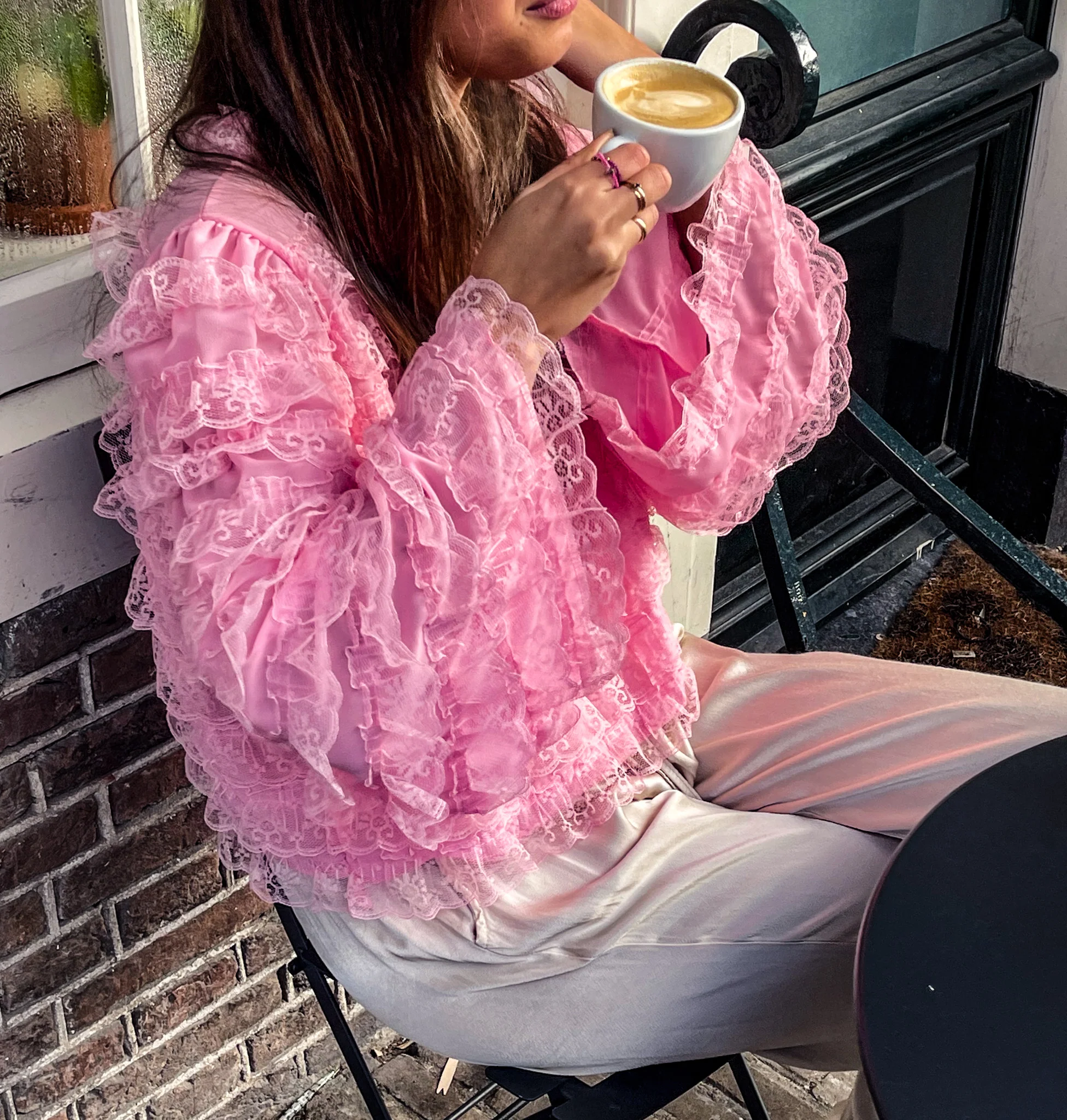 Onze Gigi blouse is een speelse blouse met vrolijke, kanten ruffles. De top heeft een loose fit en de uitlopende mouwen geven de blouse een extra touch. De blouse is licht doorschijnend en ideaal te combineren met onze favoriete Gaia Bralette!