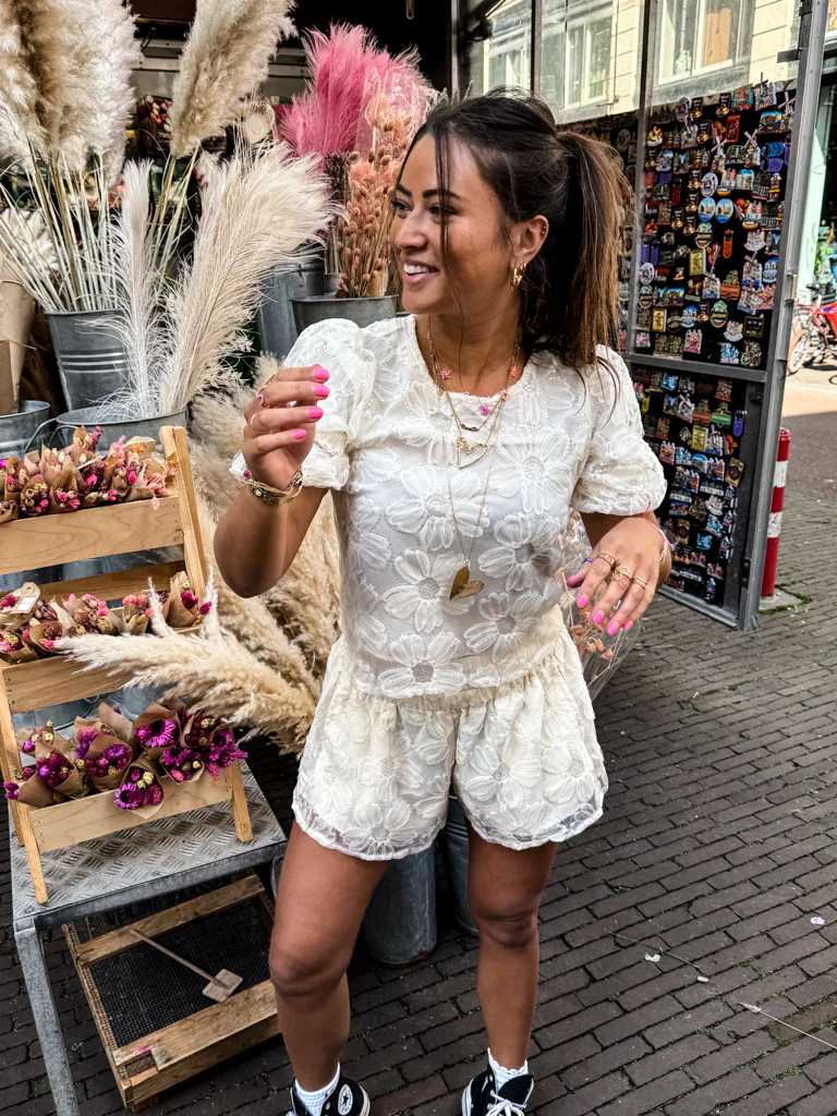 Go mysterious, go mystical, go Macarena! Met onze Macarena set scoor je gelijk een complete look. De set bestaat uit een top en een kort broekje met een mooie print en gedetailleerde onderkant. De top heeft korte pofmouwtjes en het broekje heeft een elastische tailleband en twee zakken.