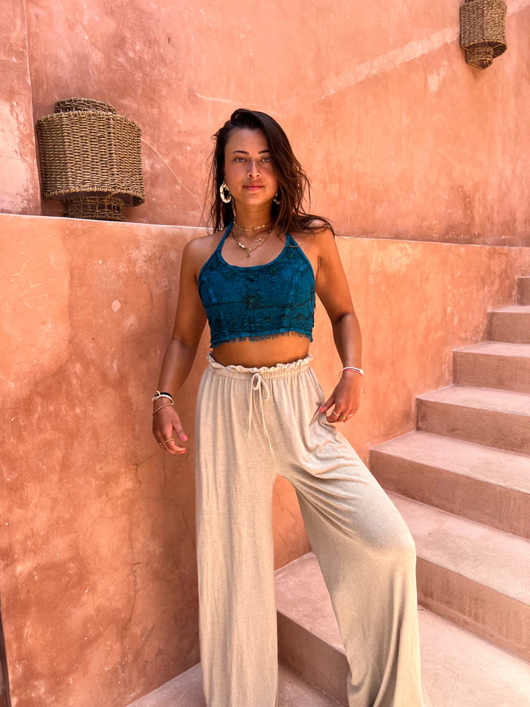 Onze Malesi top is is een cropped, boho-top met een open rug en prachtig borduursel. Elk topje is uniek, dus de print kan iets afwijken van de foto. Onder aan de top zit een gezellig randje met details.