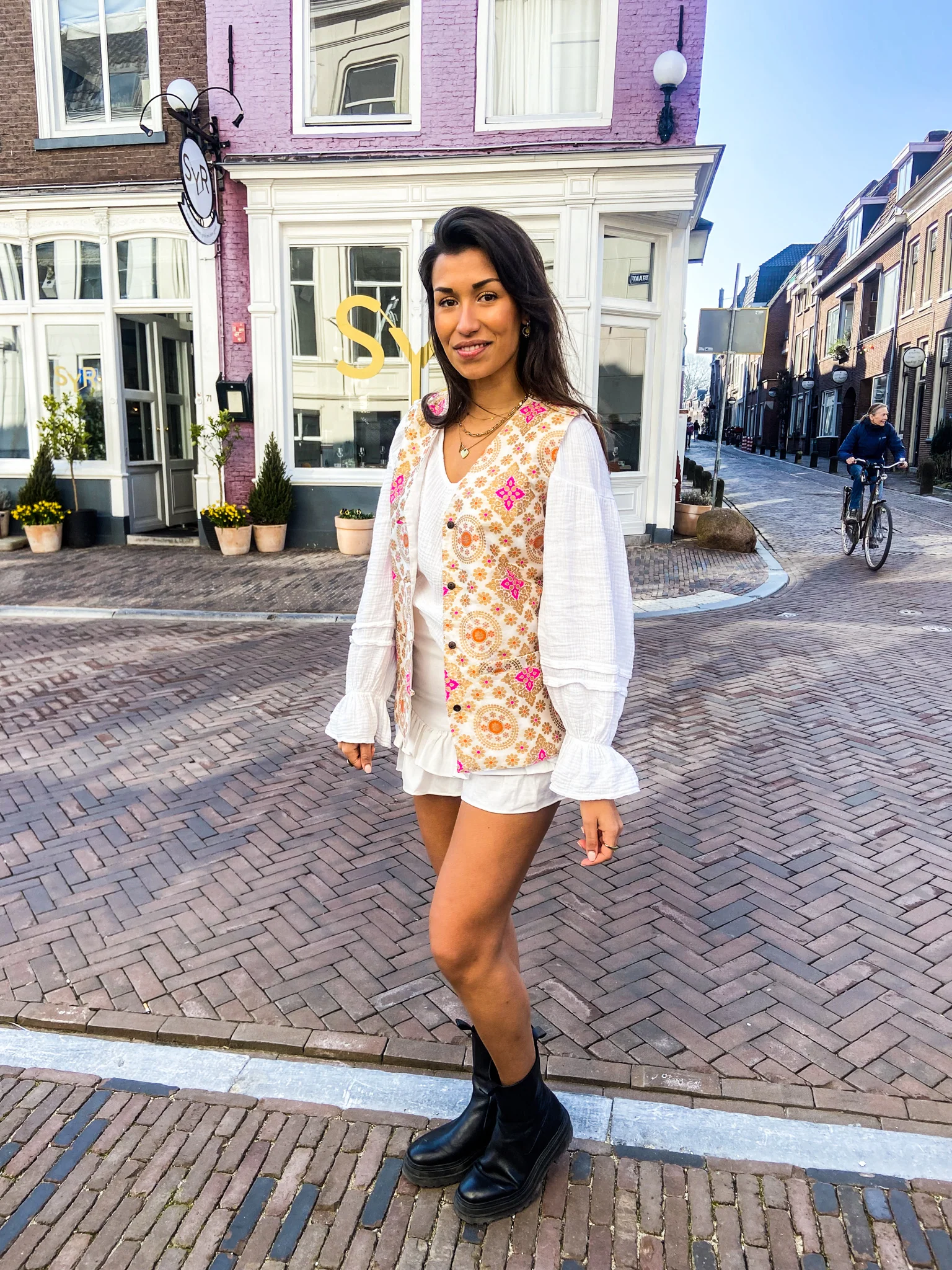 Model 1 is 1.73m en draagt maat L, model 2 is 1.74m en draagt maat M, model 3 is 1.65m en draagt maat M, model 5 is 1.70m en draagt maat M